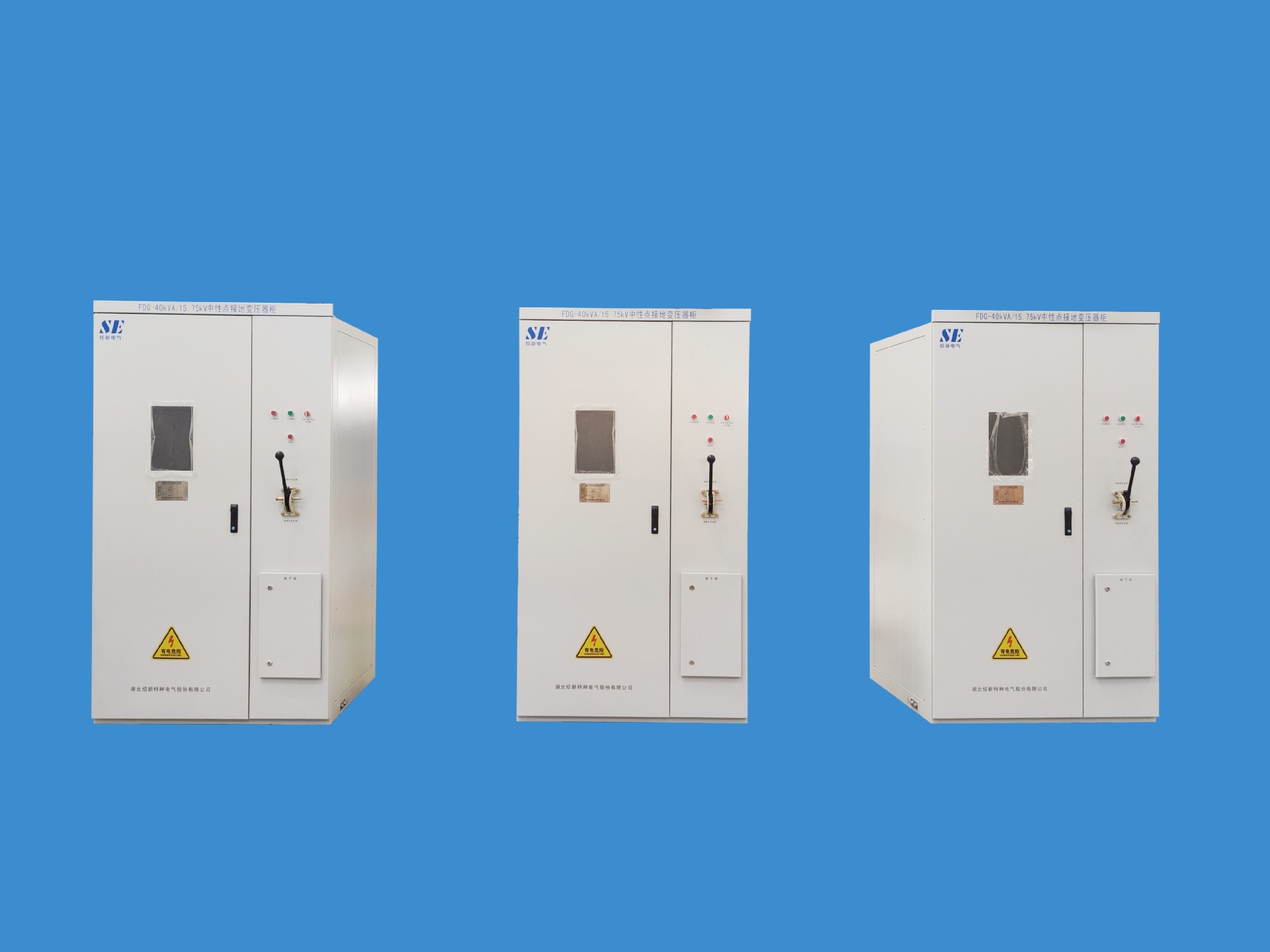 燃机型发电机中性点接地变压器柜主要用于火电站燃油发电机。该类型接地变压器柜也是发电机中性点经带二次负载的变压器接地,当发电机发生单相接地故障时立即切除机组,单相接地变及二次负载(即:电阻)额定运行时间按10min设计(按IEC标准,过载时间10min,过载倍数2.6,确保变压器能2.6倍过载10min),接地设备符合ANSI/IEEE C37.101-1985《发电机接地保护导则》(若有新版本,则以最新版本为准)的全部要求,整个接地装置集成于一个柜体内。